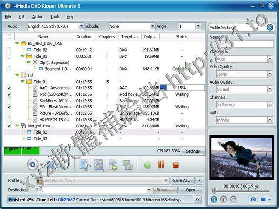 4Media DVD Ripper Ultimate專業的視頻處理軟體,可以轉換如AVI,MPEG,WMV,MP4,